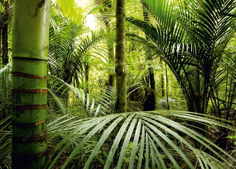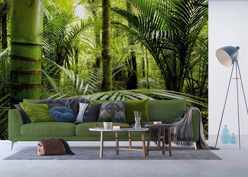 Treten Sie mit dieser detaillierten Fototapete in einen lebendigen Dschungel voller Abenteuer ein. Die tiefgrünen Farbtöne und die vielfältigen Pflanzen verleihen ein Gefühl von Tiefe und Geheimnis.