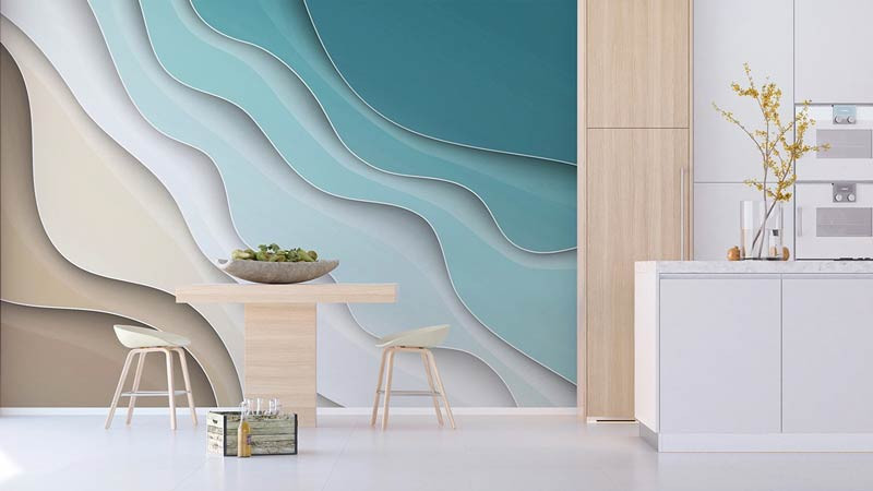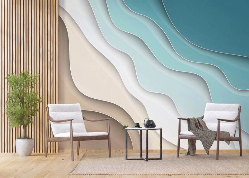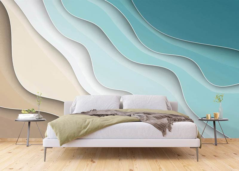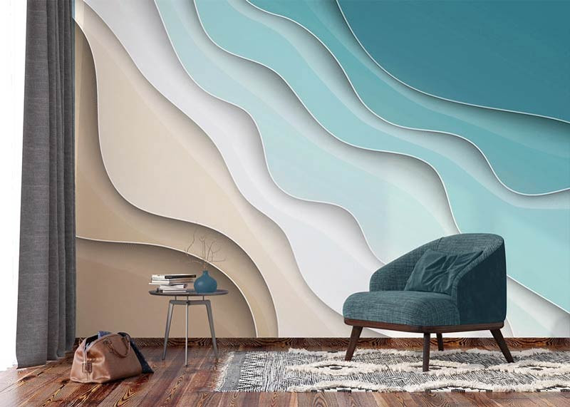 Genießen Sie die fließenden Linien und sanften Farben auf der Fototapete Abstrakte Wellen. Die verschiedenen Blautöne und die wellenförmigen Muster vermitteln ein Gefühl von Ruhe und Kontinuität.