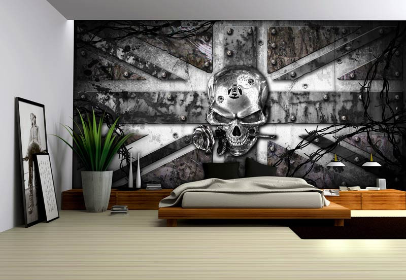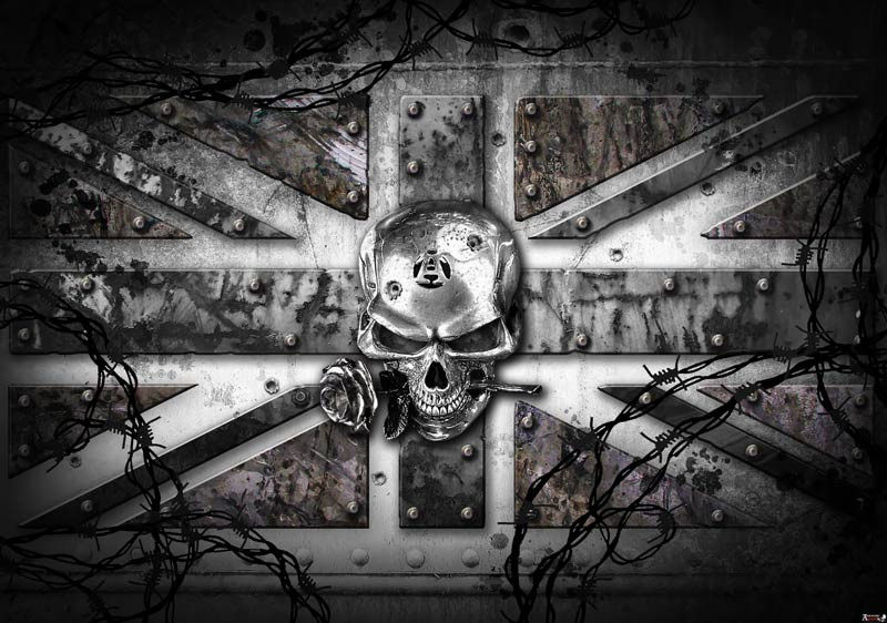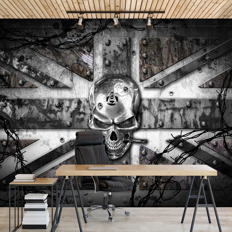 Fototapete mit der Flagge des Vereinigten Königreichs mit einem Totenkopf und einer Rose, gerendert in schwarz und weiß.
