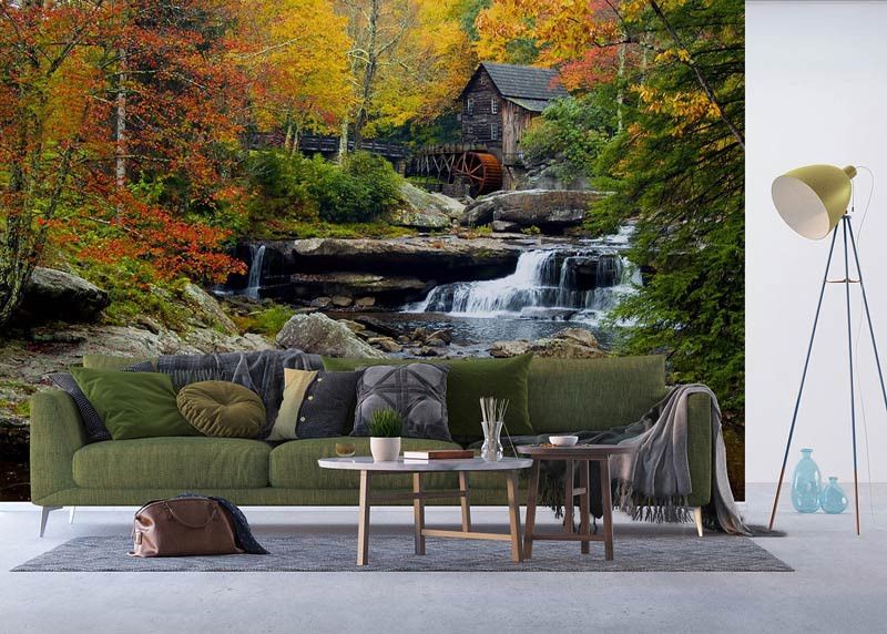 Holen Sie sich mit der Fototapete Alte Getreidemühle im Babcock State Park die Ruhe der Landschaft in Ihr Zuhause. Die warmen Erdtöne und die beeindruckenden Details der Mühle und der umliegenden Natur sorgen für einen authentischen Look.