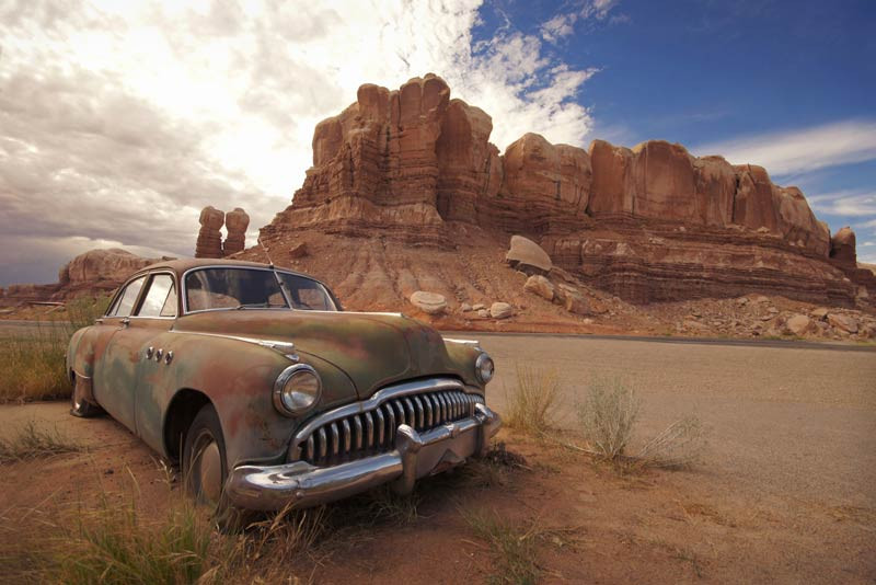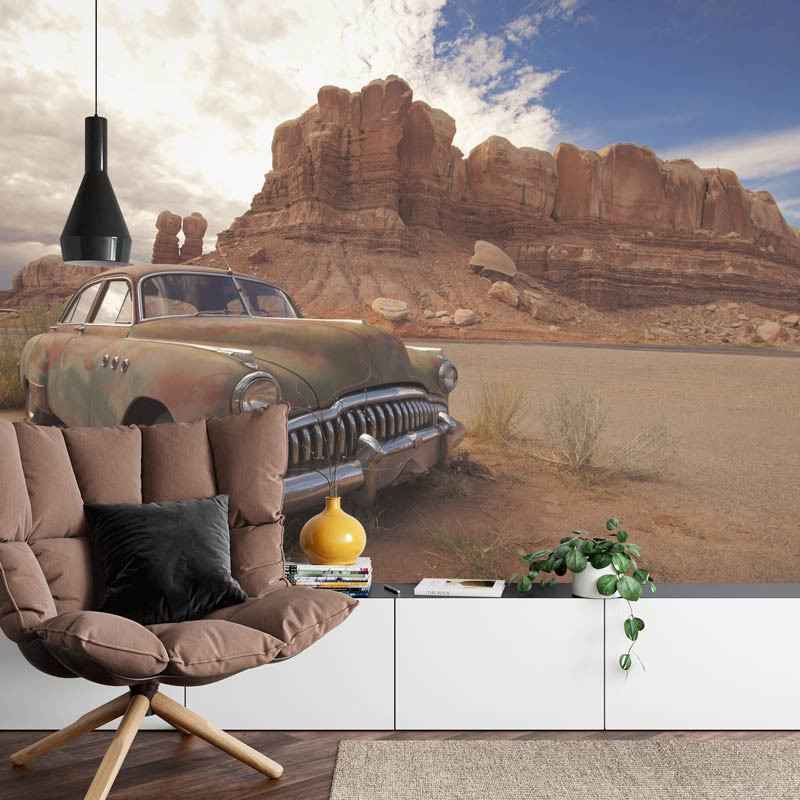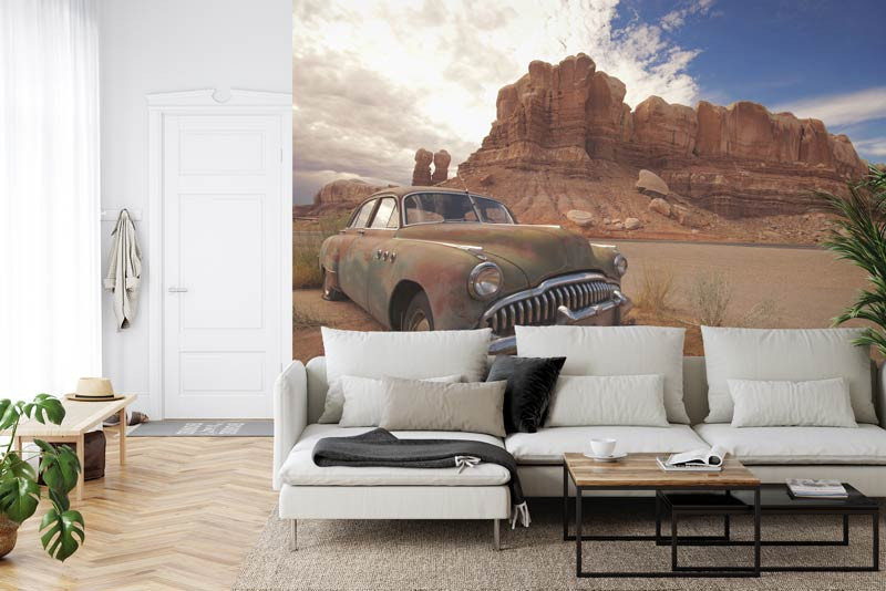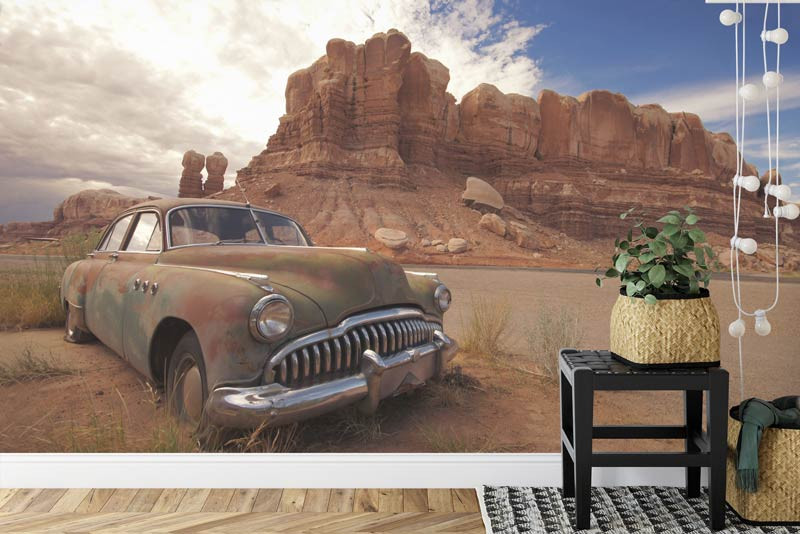 Reisen Sie zurück in die Vergangenheit mit der Fototapete Old Car in the Desert. Tauchen Sie ein in die Mystik der Wüste, wenn ein verlassenes Auto inmitten riesiger Sanddünen und eines endlosen Horizonts seinen Platz findet. Erleben Sie die Schönheit der Trostlosigkeit und die zeitlose Stille der Wüste.