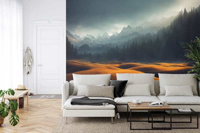 Verwandeln Sie Ihr Wohnzimmer, Schlafzimmer oder Büro in eine Oase der Ruhe und Schönheit mit der Fototapete Atemberaubende Natur Berglandschaft. Lassen Sie sich von der majestätischen Pracht der Berggipfel faszinieren, die sich aus einem Meer von Grün erheben, umgeben von einer üppigen Landschaft, die atemberaubend schön ist. Erleben Sie die Gelassenheit der Natur, während Sie in die zeitlose Schönheit dieser Berglandschaft eintauchen.