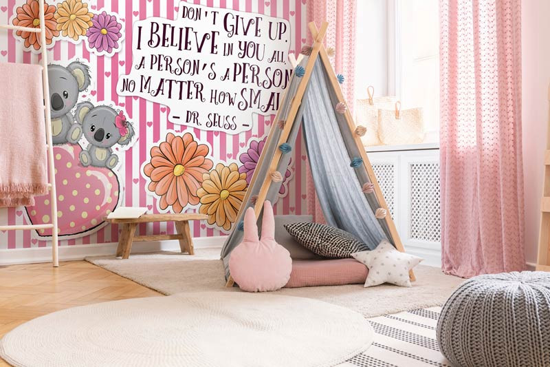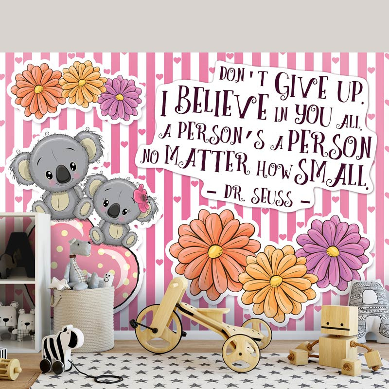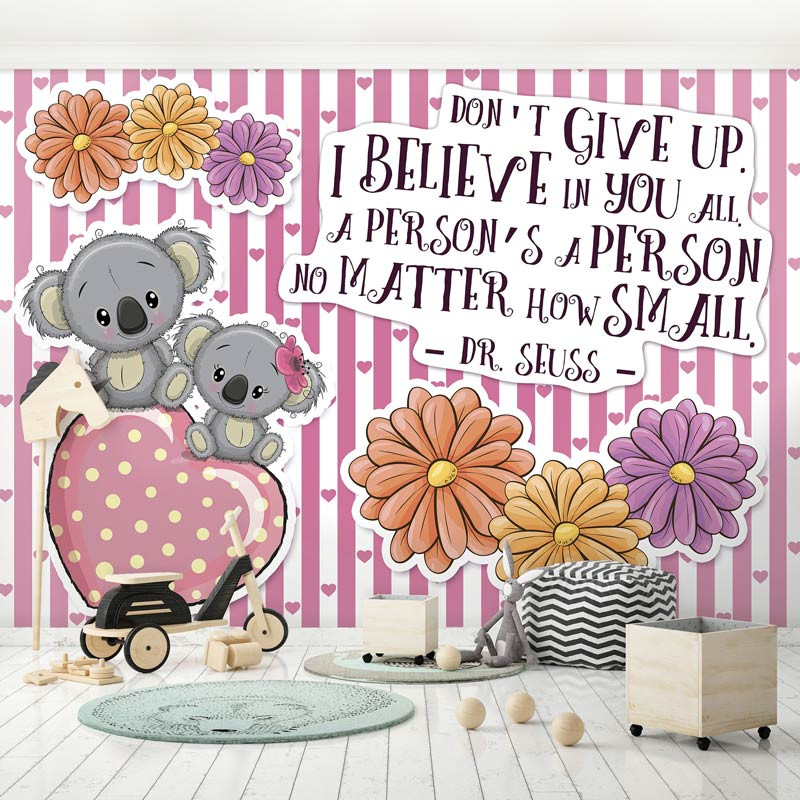 Fototapete von 2 Koalabären, die auf einem Herz sitzen, begleitet von einem eingängigen Spruch.