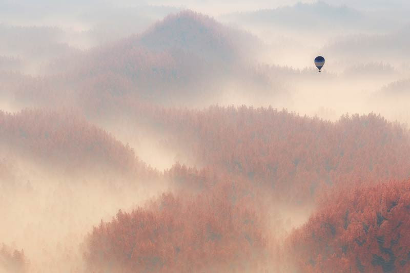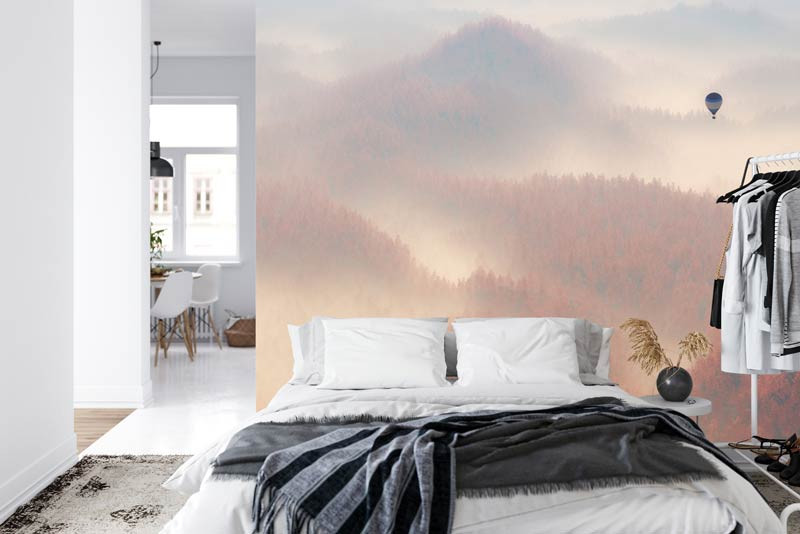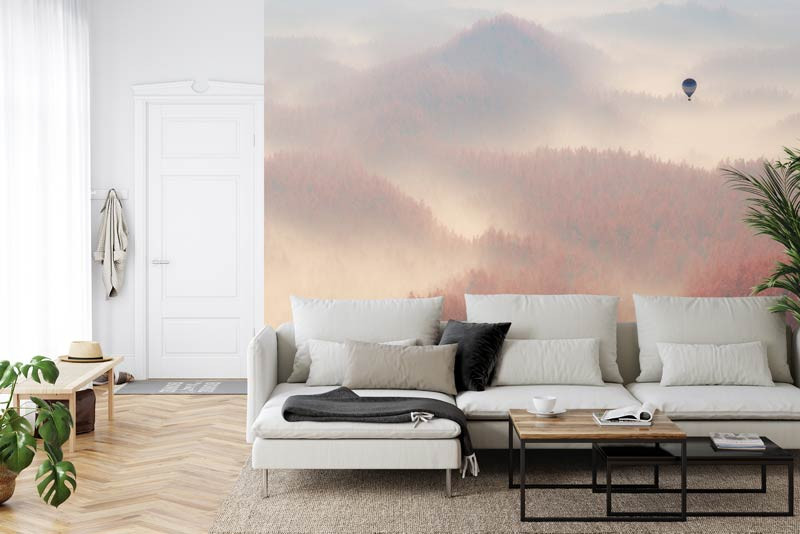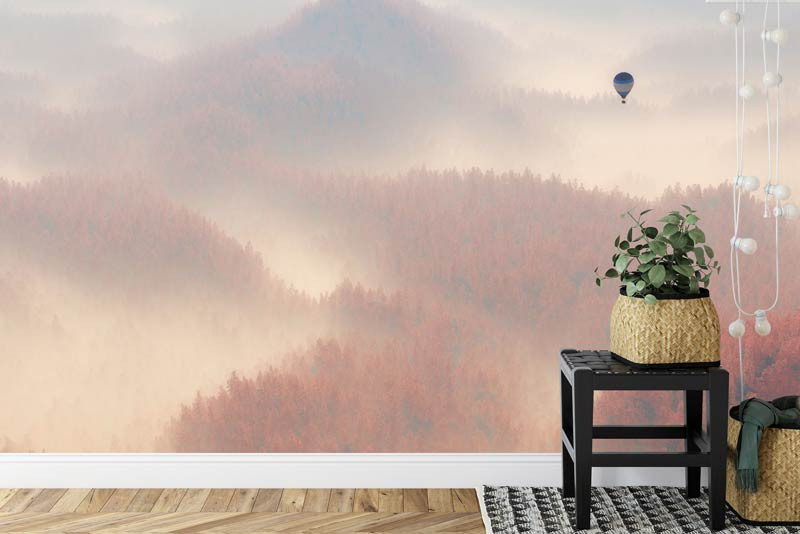 Steigen Sie auf zu neuen Höhen mit der Fototapete Heißluftballon über dem Nebelwald. Lassen Sie sich von der atemberaubenden Aussicht aus einem Heißluftballon hoch über einem geheimnisvollen Wald, der von einem Hauch von Nebel und Mysterium umhüllt ist, faszinieren.