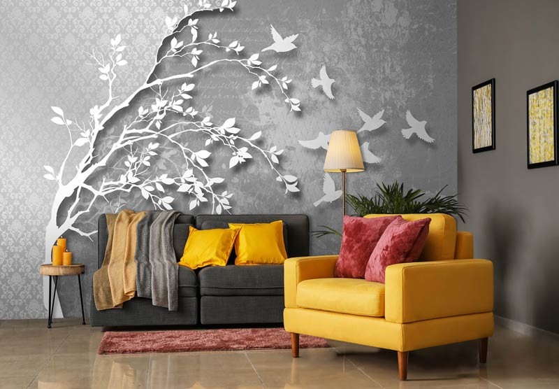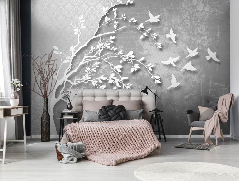 Abstrakte Vlies Fototapete eines schönen Baumes, umgeben von einer Reihe von Vögeln, auf einem silbernen Hintergrund angezeigt.