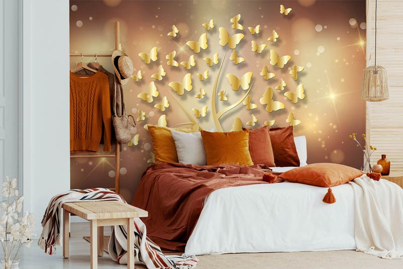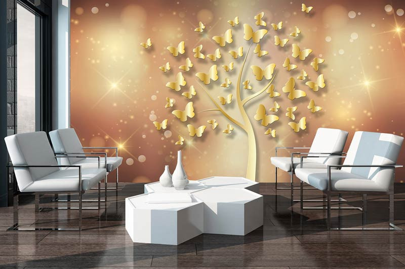 Vlies Fototapete eines abstrakten goldenen funkelnden Baumes voller Schmetterlinge.
