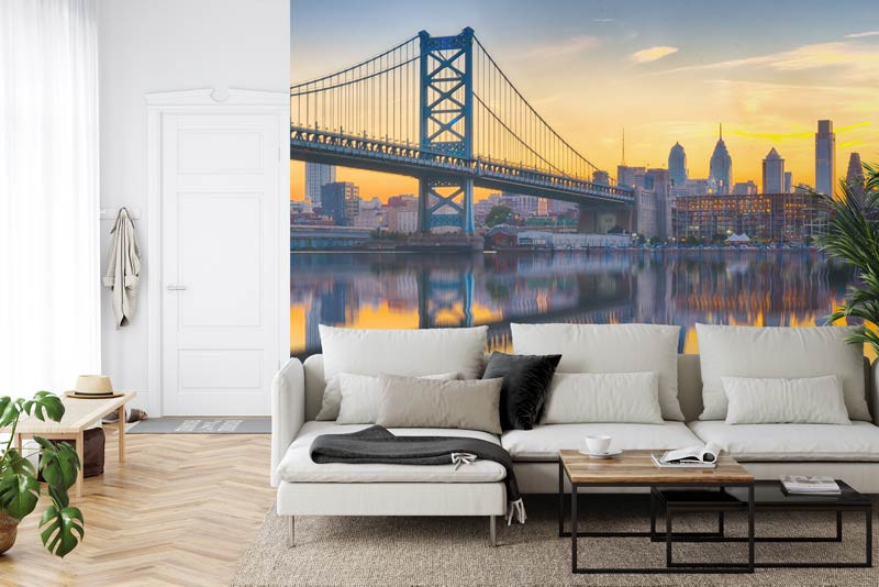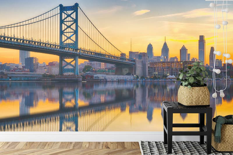 Genießen Sie die schöne Aussicht auf die Ben Franklin Bridge in Philadelphia mit unserer Fototapete. Bringen Sie die Energie dieser pulsierenden Stadt in Ihr Interieur und schaffen Sie eine Atmosphäre von urbaner Eleganz.