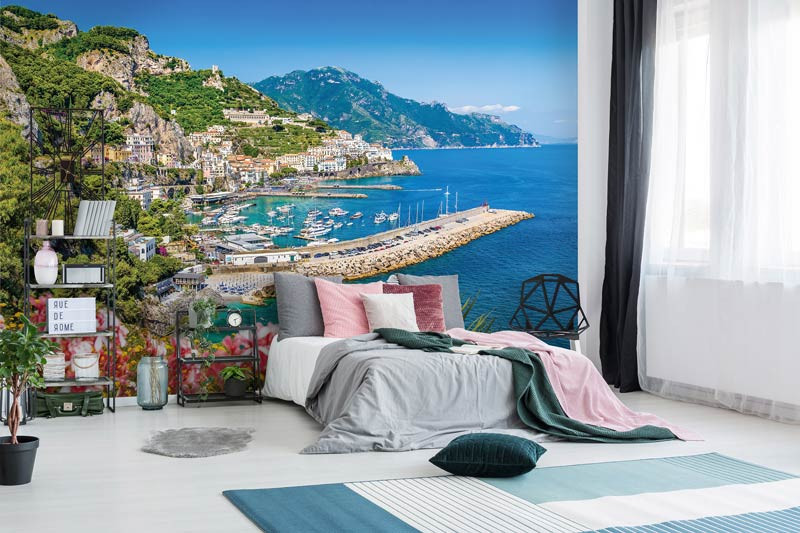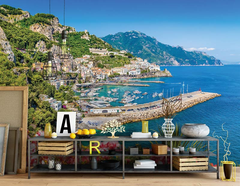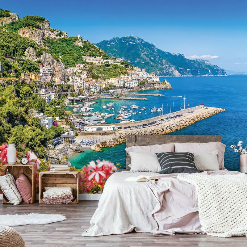 Vlies Fototapete der schönen Aussicht auf Bergdörfer am Rande des klaren blauen Wasser.