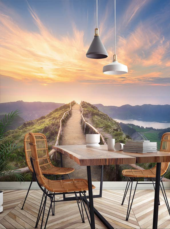 Fototapete von einem Wanderweg hoch in den Bergen, mit dem farbigen Himmel der untergehenden Sonne im Hintergrund.