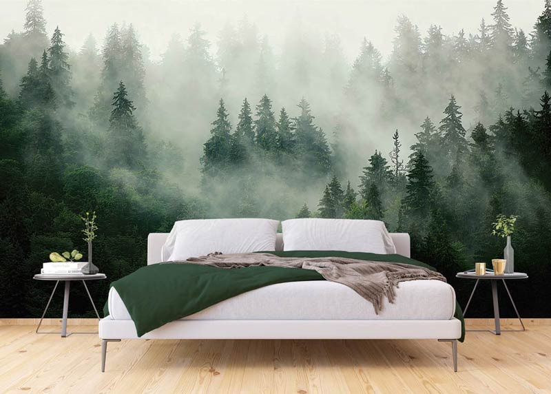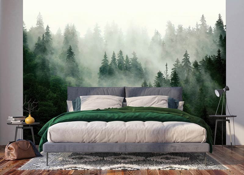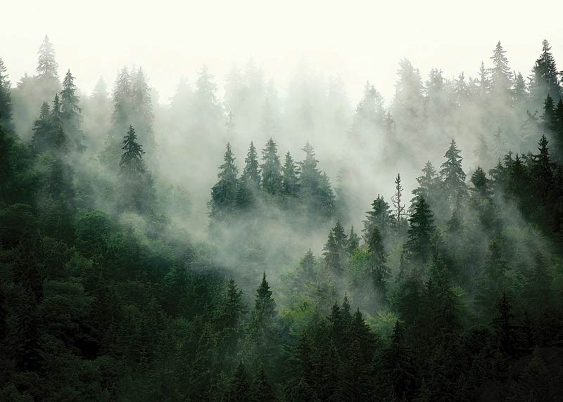 Treten Sie ein in einen frischen Bergwald, der in Morgennebel gehüllt ist. Die leuchtenden Grüntöne und der sanfte Nebel schaffen eine beruhigende und erfrischende Atmosphäre, die sich ideal für Wohn- und Schlafräume eignet. Diese Fototapete ist leicht anpassbar, damit sie perfekt passt.