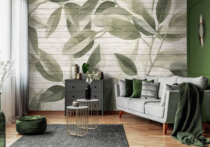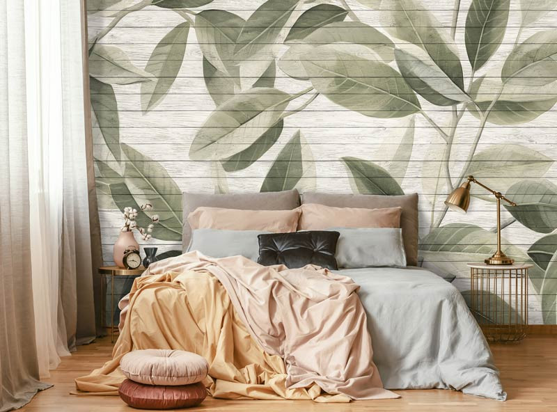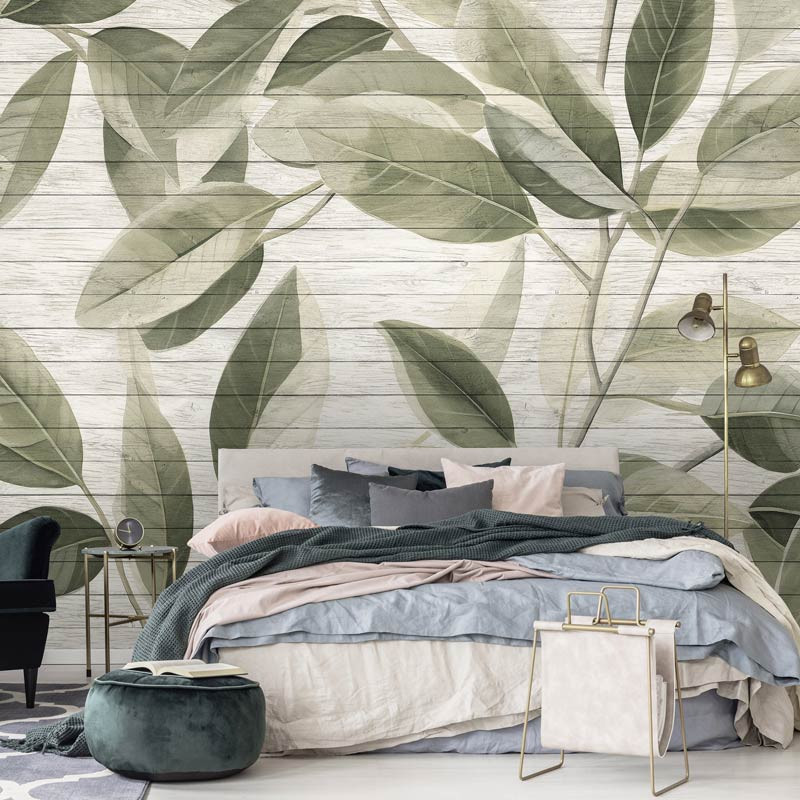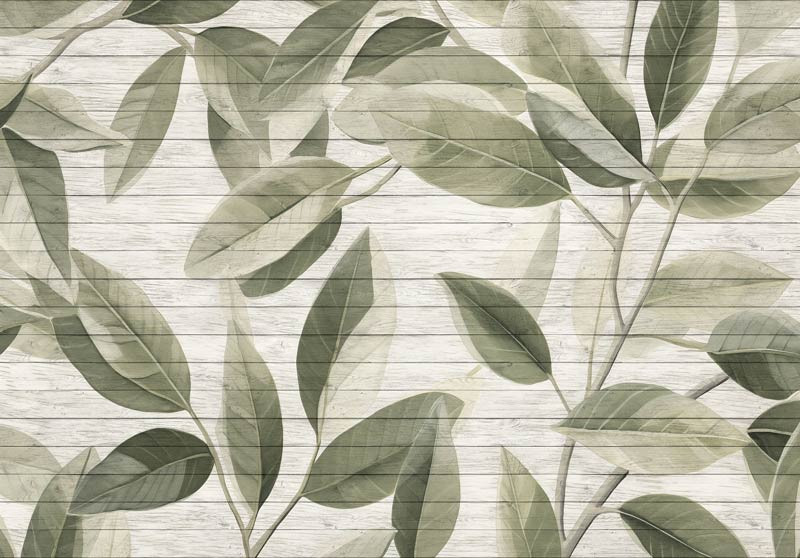 Verleihen Sie Ihrer Einrichtung einen natürlichen Touch mit unserer Fototapete Blätter auf Holzbrettern. Dieses rustikale Design kombiniert die Schönheit von Blättern mit der Wärme von Holzbrettern und schafft eine gemütliche und einladende Atmosphäre. Ideal für Wohnzimmer, Schlafzimmer, Küchen oder Flure.