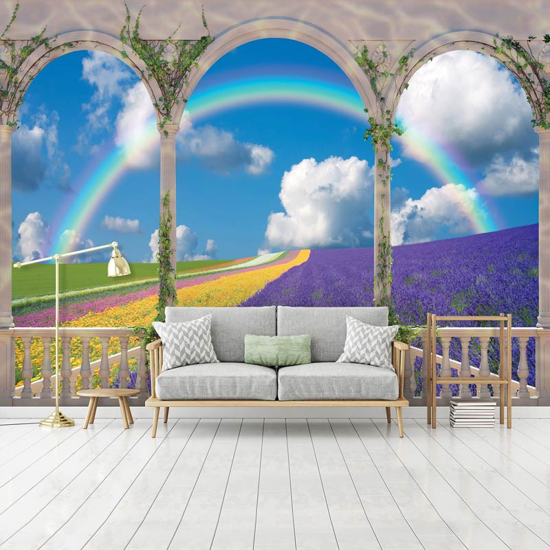 3D Vlies-Fototapete mit der schönen Aussicht auf das bunte Blumenfeld von der Terrasse aus gesehen.
