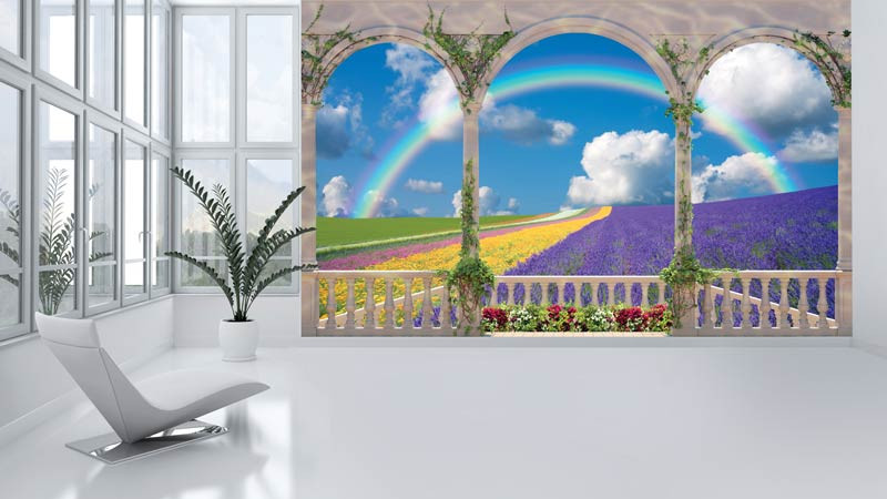 Fototapete Blick auf das Blumenfeld von der Terrasse in 3D