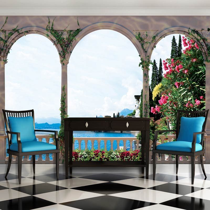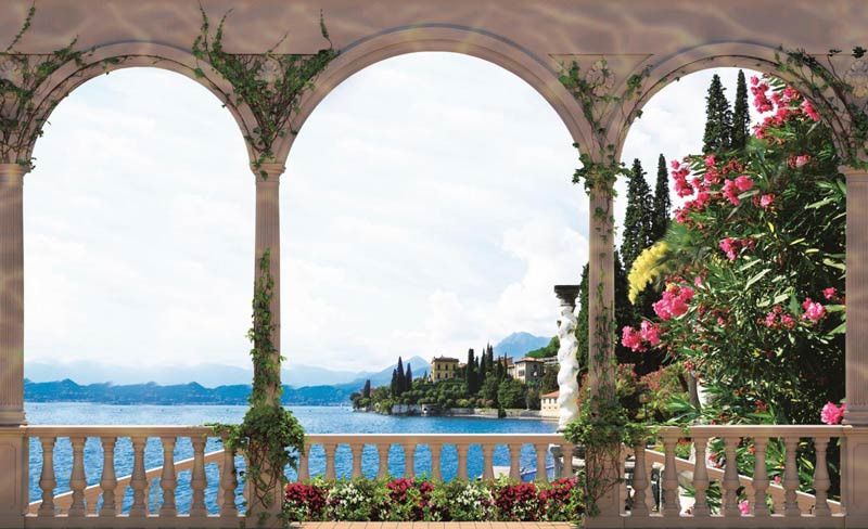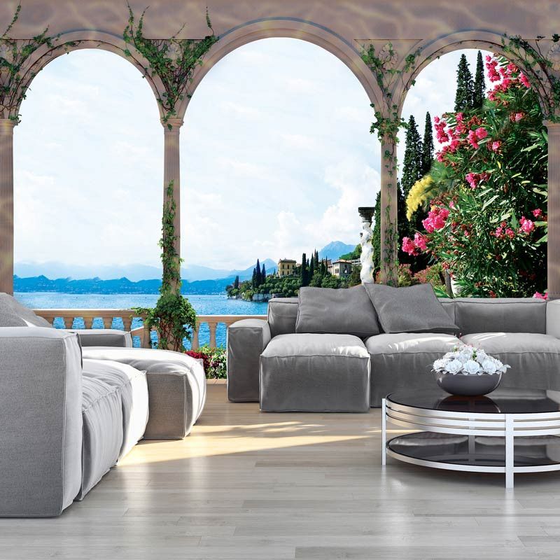 3D Vlies Fototapete mit dem schönen Blick auf den klaren blauen See von der Terrasse aus gesehen.