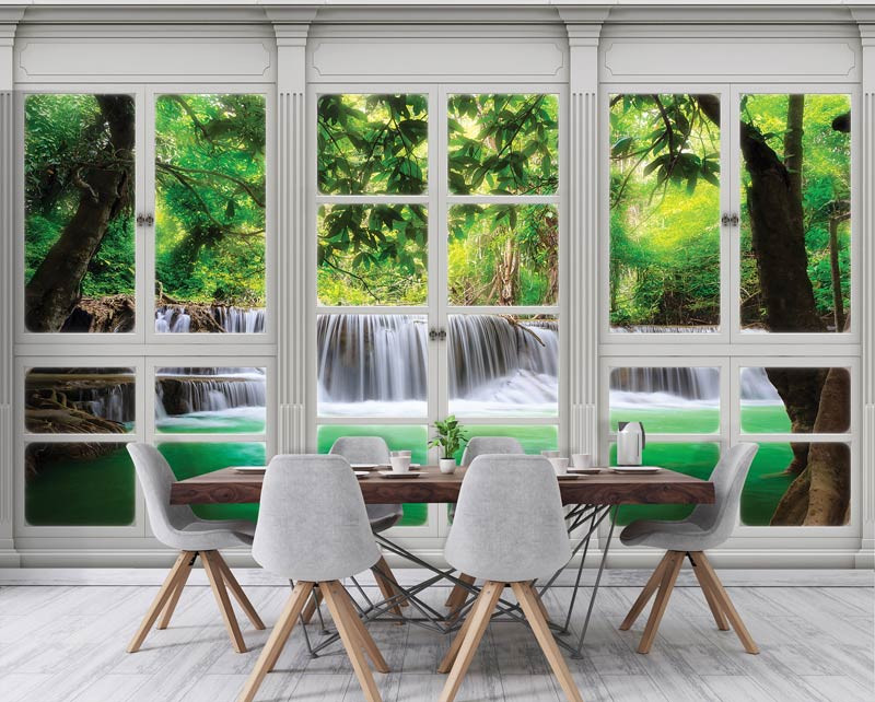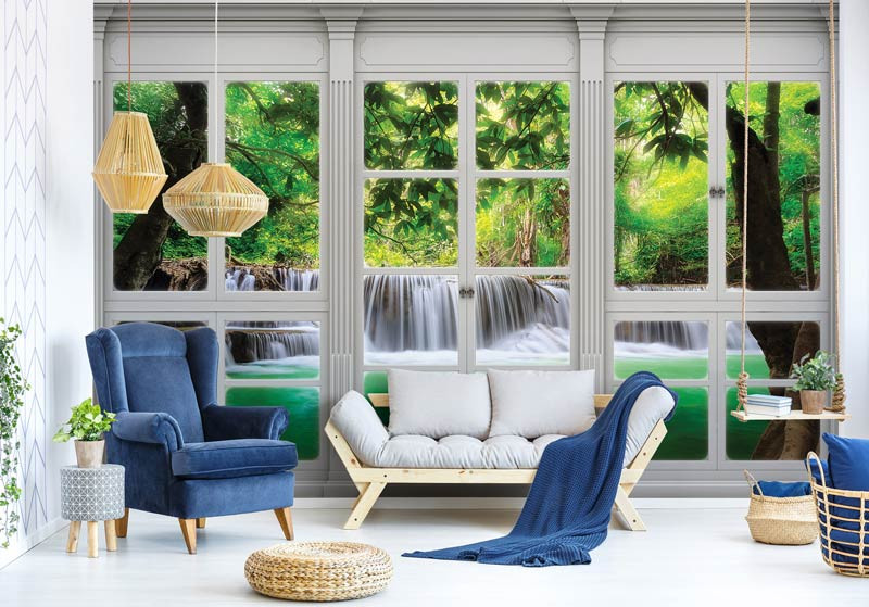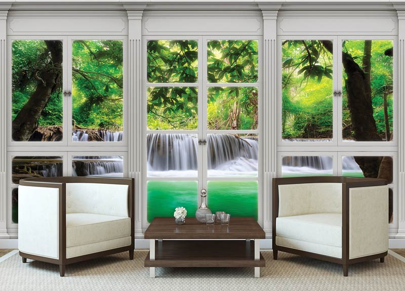 3D Vliestapete der Blick auf einen schönen Wasserfall aus dem Fenster gesehen.