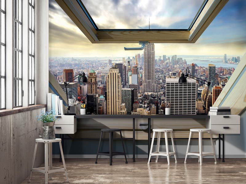 Vlies Fototapete Blick auf New York aus dem Dachfenster, in 3D gerendert.