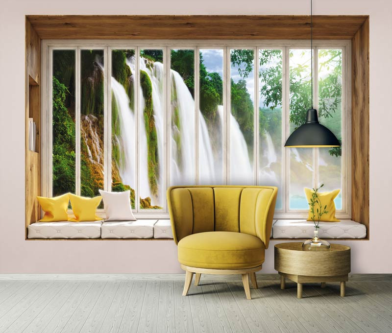 3D Vliestapete mit dem Blick auf einen schönen, großen Wasserfall, gesehen durch das Fenster.