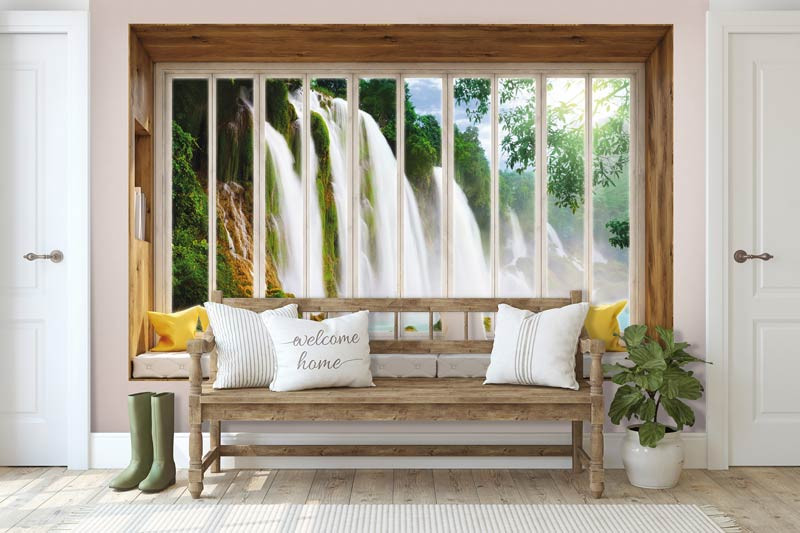 Fototapete Blick aus dem Fenster auf einen großen Wasserfall 3D
