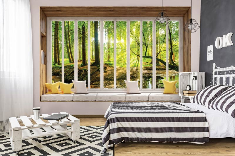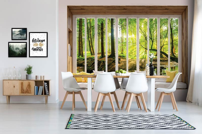 Fototapete Blick durch das Fenster auf den sonnigen Wald 3D-Perspektive