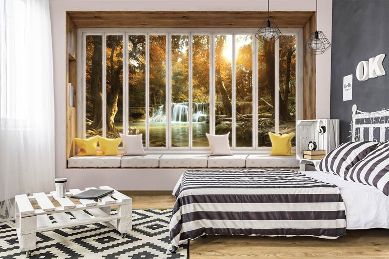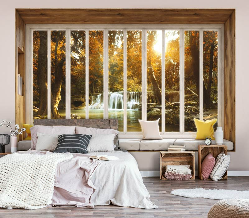 Vliestapete mit dem Blick auf einen Wasserfall in einem schönen, herbstlichen Wald, gesehen aus dem Fenster. Dadurch entsteht ein fantastischer 3D-Effekt!