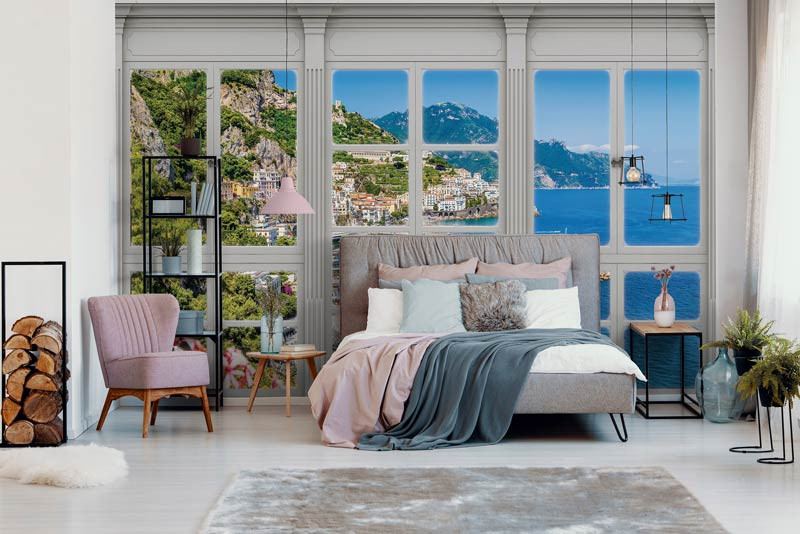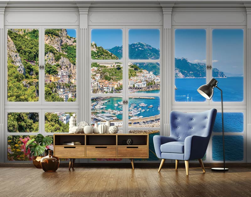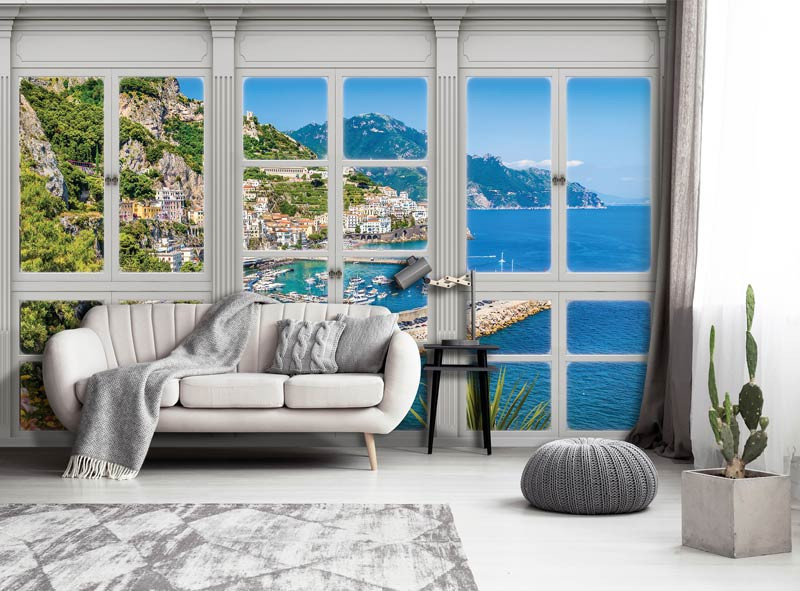 3D Vliestapete mit Blick auf die Stadt in den Bergen am Meer, wie aus dem Fenster gesehen.