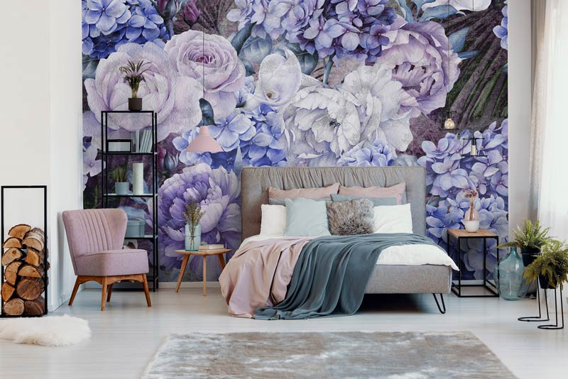 Fototapete mit schönen, lila und blauen, gemalten Blumen.