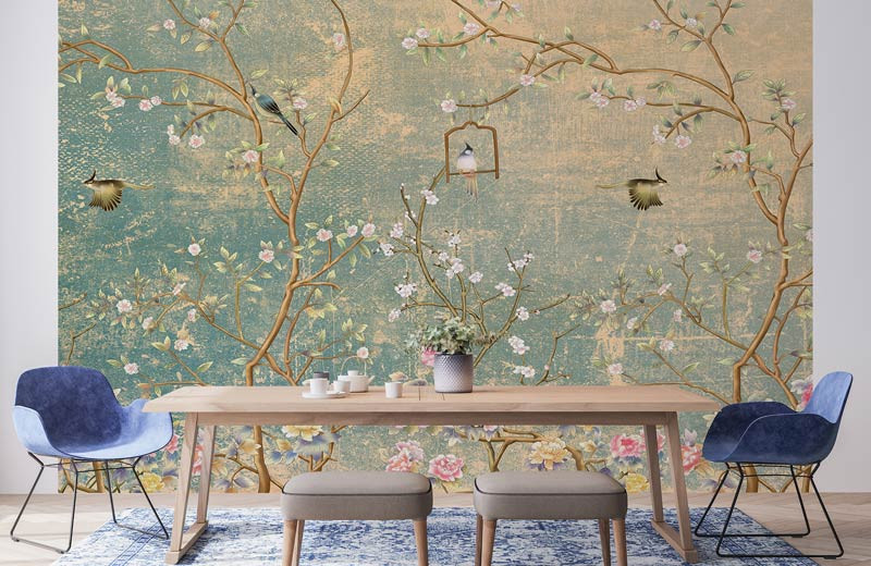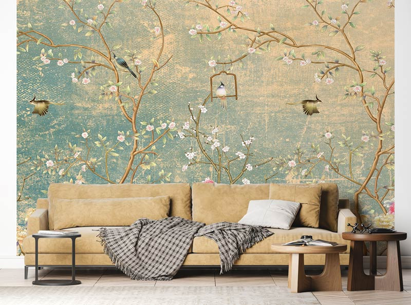 Fototapete Blumen und Vögel auf Grunge-Wand