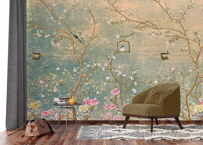 Mit dieser Fototapete mit Blumen und Vögeln auf einem Grunge-Hintergrund schaffen Sie eine einzigartige Mischung aus Natur und urbanem Stil. Die detaillierten Blumen und die subtile, raue Textur verleihen ein künstlerisches Gefühl. Einfach in der Größe zu bestellen.