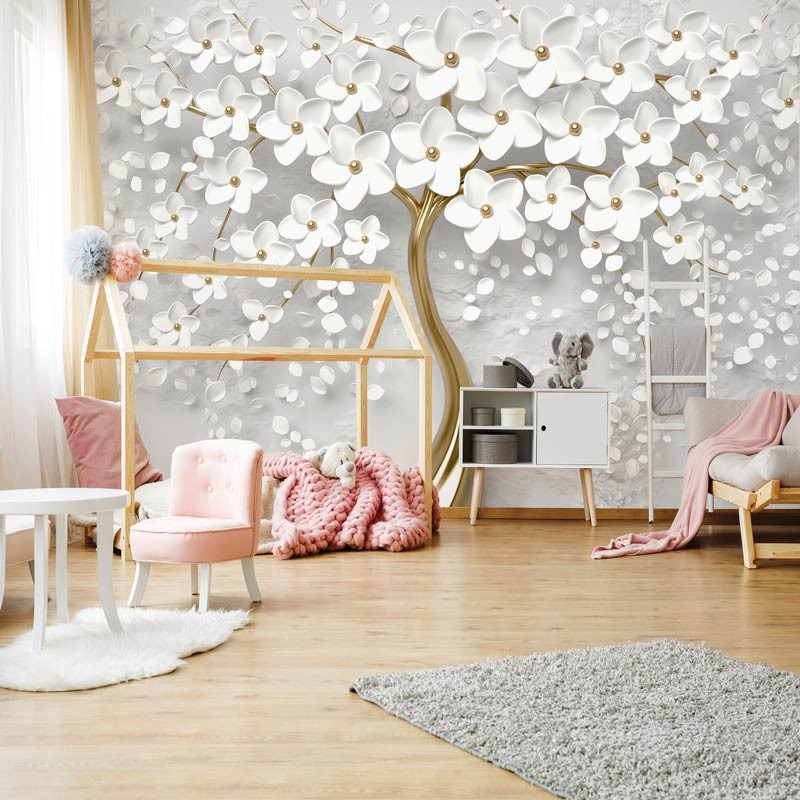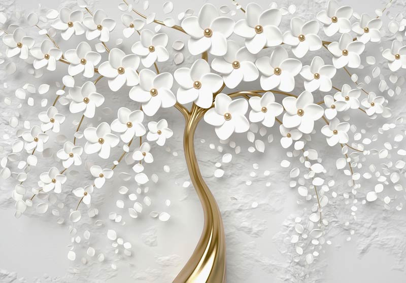 Fototapete von einem goldenen Baum voller weißer Blumen.