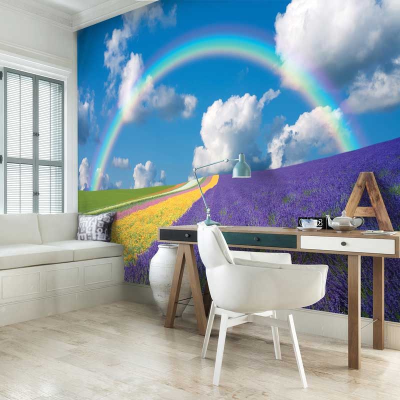 Vlies Fototapete eines bunten Blumenfeldes mit einem schönen Regenbogen im Hintergrund. Bringt ein Sommergefühl ins Wohnzimmer, Schlafzimmer, Flur, Büro oder jeden anderen Raum.
