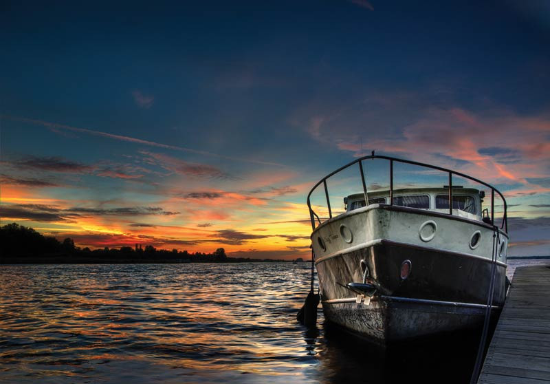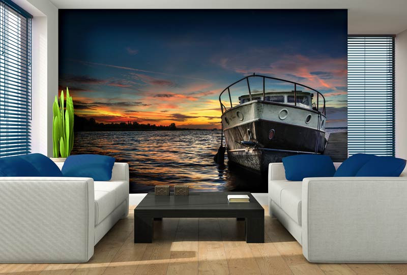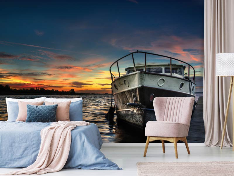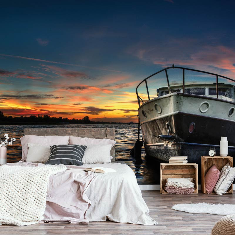 Vliestapete von einem Boot, auf dem Meer, bei einem schönen Sonnenuntergang.