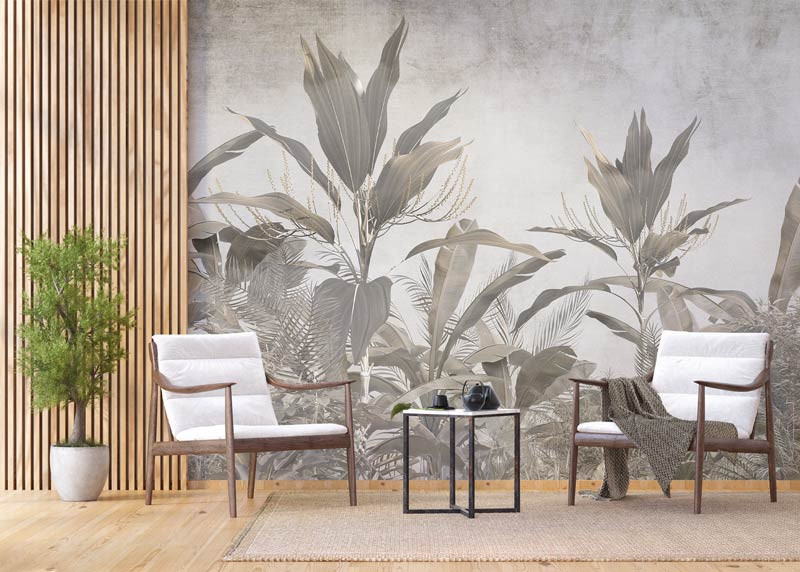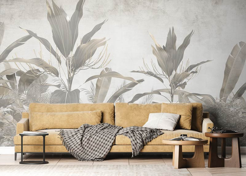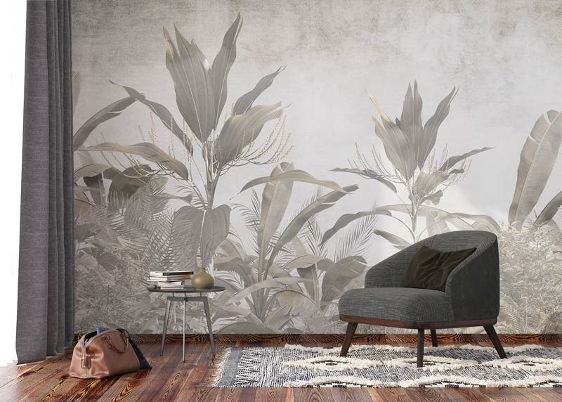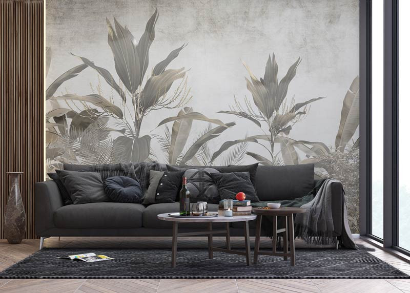 Holen Sie sich mit der Fototapete Botanical Jungle Atmosphere die Üppigkeit des Dschungels ins Haus. Die Kombination aus großen tropischen Blättern, verspielten Schatten und leuchtenden Farben erzeugt einen dynamischen und exotischen Effekt.