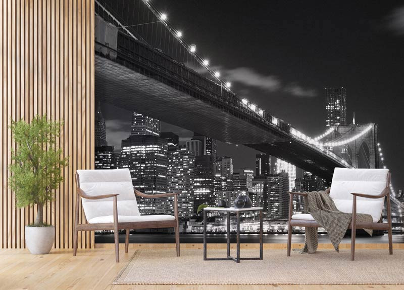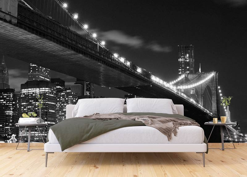 Genießen Sie den ikonischen Blick auf die Brooklyn Bridge bei Nacht. Diese Fototapete fängt die Atmosphäre der New Yorker Stadtlichter und der majestätischen Brücke perfekt ein. Eine einzigartige Ergänzung für Wohnräume oder Büros.