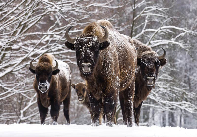 Fototapete von einem Paar prächtiger Büffel im Schnee.