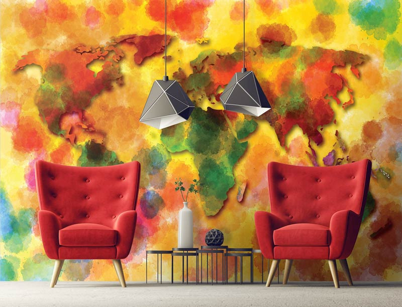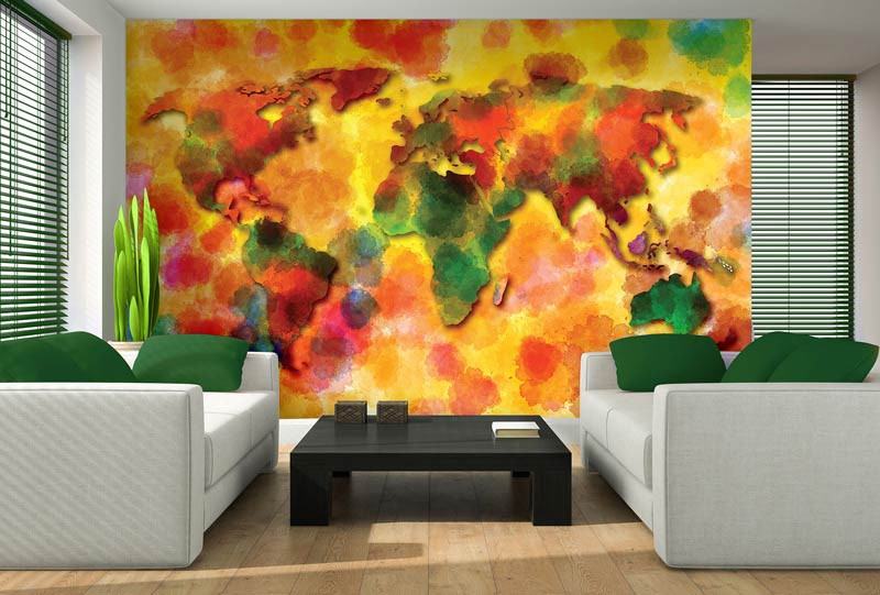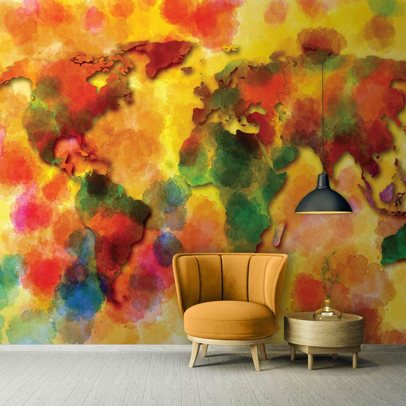 Vlies Fototapete mit einem gemalten, abstrakten Kunstwerk, das eine bunte Weltkarte darstellt.