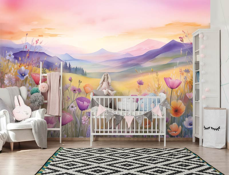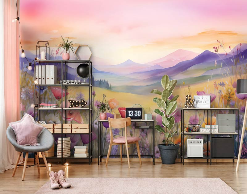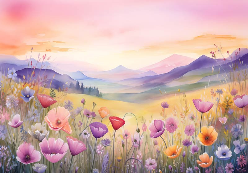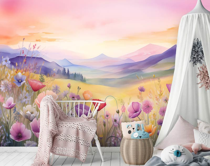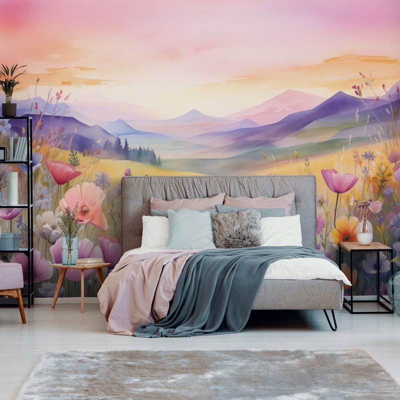 Schaffen Sie eine bezaubernde Umgebung in Ihrem Zuhause mit unserer Fototapete Colourful Landscape Painting. Diese schöne Fototapete zeigt eine lebendige Landschaft mit üppiger Vegetation und farbenfrohen Blumen, die ein Gefühl der Ruhe und des Staunens vermitteln.