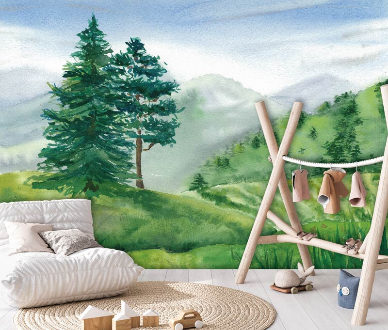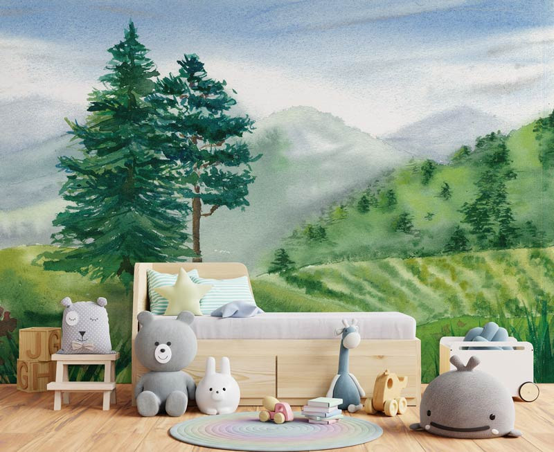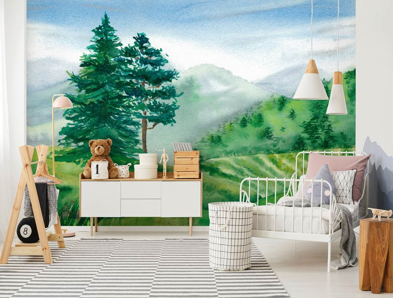 Schaffen Sie eine verspielte und farbenfrohe Landschaft im Kinderzimmer mit unserer Fototapete Children's Landscape. Diese fröhliche Fototapete zeigt eine lebendige Szene mit Bergen, Bäumen, Tieren und vielem mehr, die in jedem Zimmer ein Gefühl von Abenteuer und Fantasie erzeugt. Perfekt für Kinder, die farbenfrohe und fantasievolle Dekorationen lieben, ideal für das Babyzimmer oder Kinderzimmer.