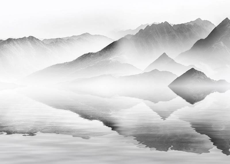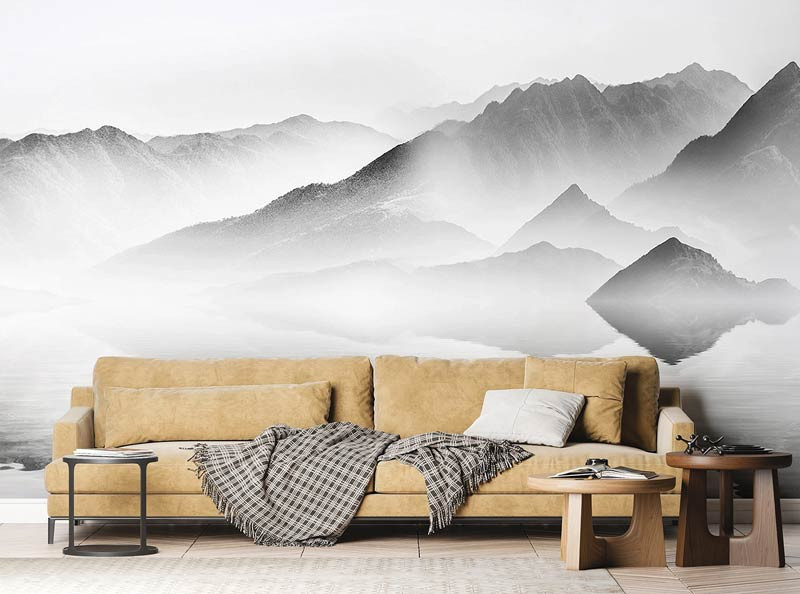 Holen Sie sich mit diesem Tuschedesign die Eleganz einer traditionellen chinesischen Landschaft in Ihr Zuhause. Die weichen Schwarz- und Weißtöne und die detaillierten Linien schaffen eine ruhige Atmosphäre. Diese Fototapete ist leicht anpassbar.