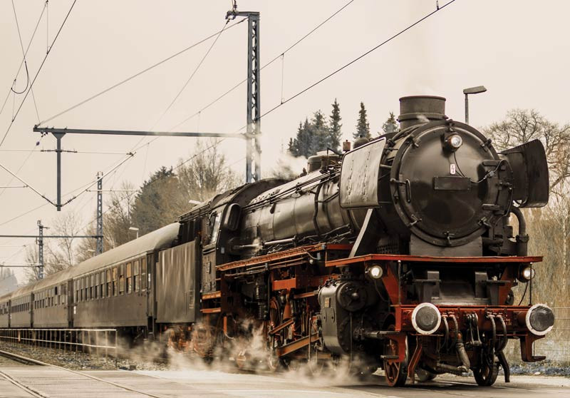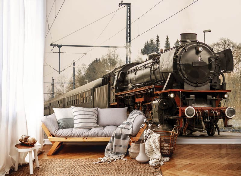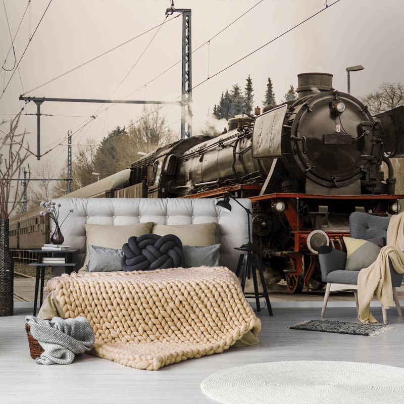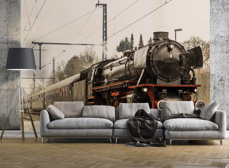 Die Fototapete Dampflokomotive ist ein echter Blickfang im: Wohnzimmer, Schlafzimmer, Hobbyraum, Küche, Flur, Büro oder jedem anderen Raum.