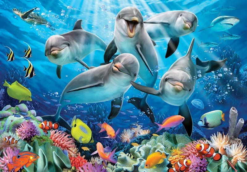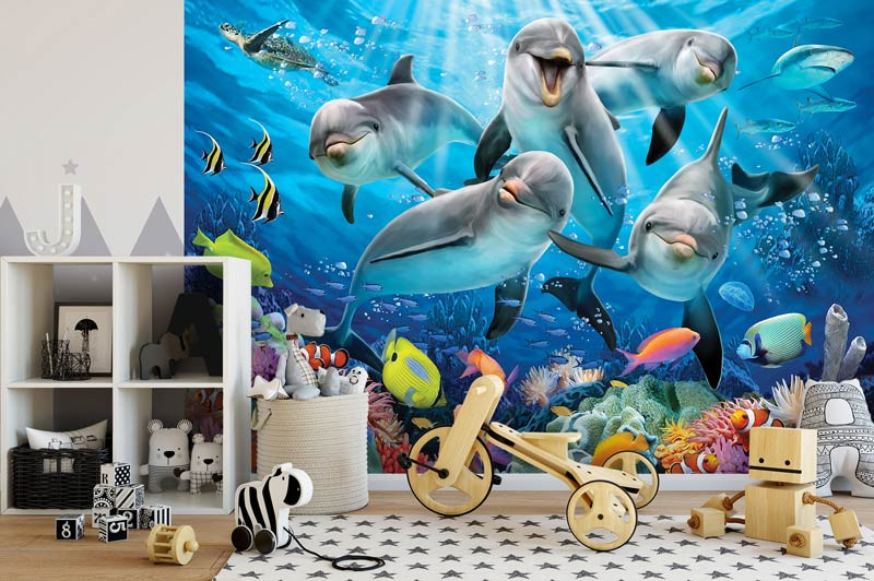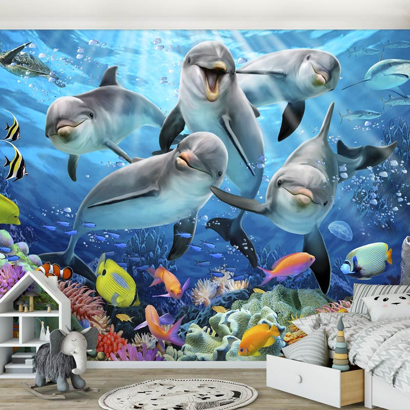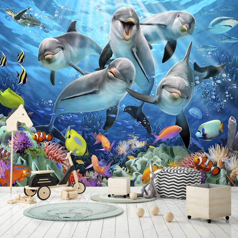 Vlies Fototapete einer fantastischen Unterwasserwelt, mit einigen schönen, fröhlichen Delphinen.