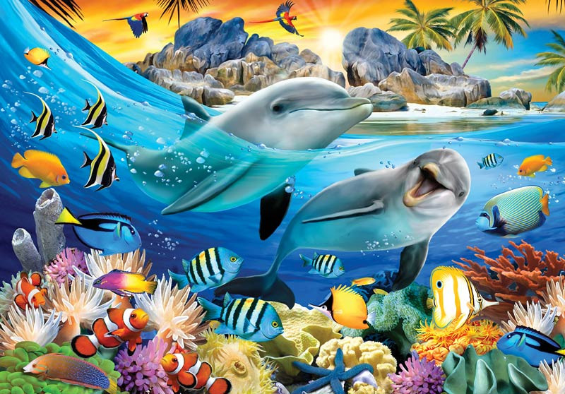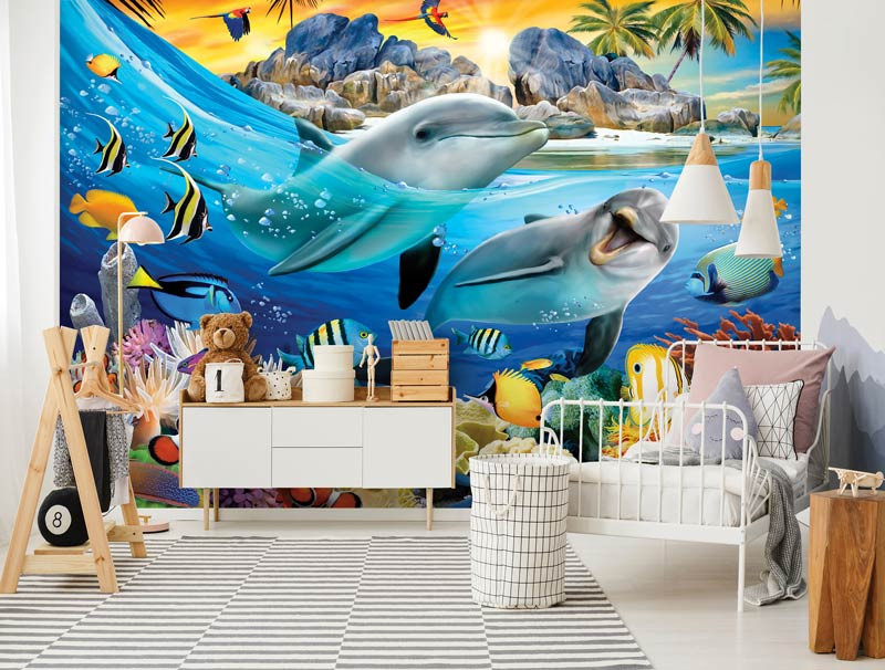 Vlies-Fototapete einer fantastischen Unterwasserwelt, die einige schöne, glückliche Delphine und einige tropische Fische zeigt.