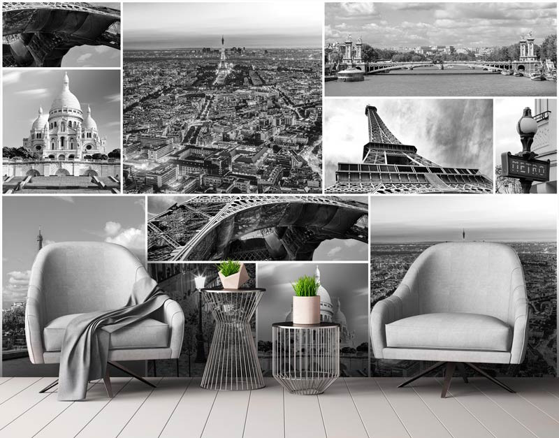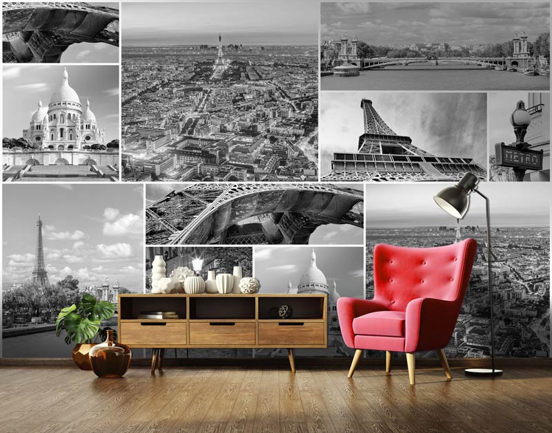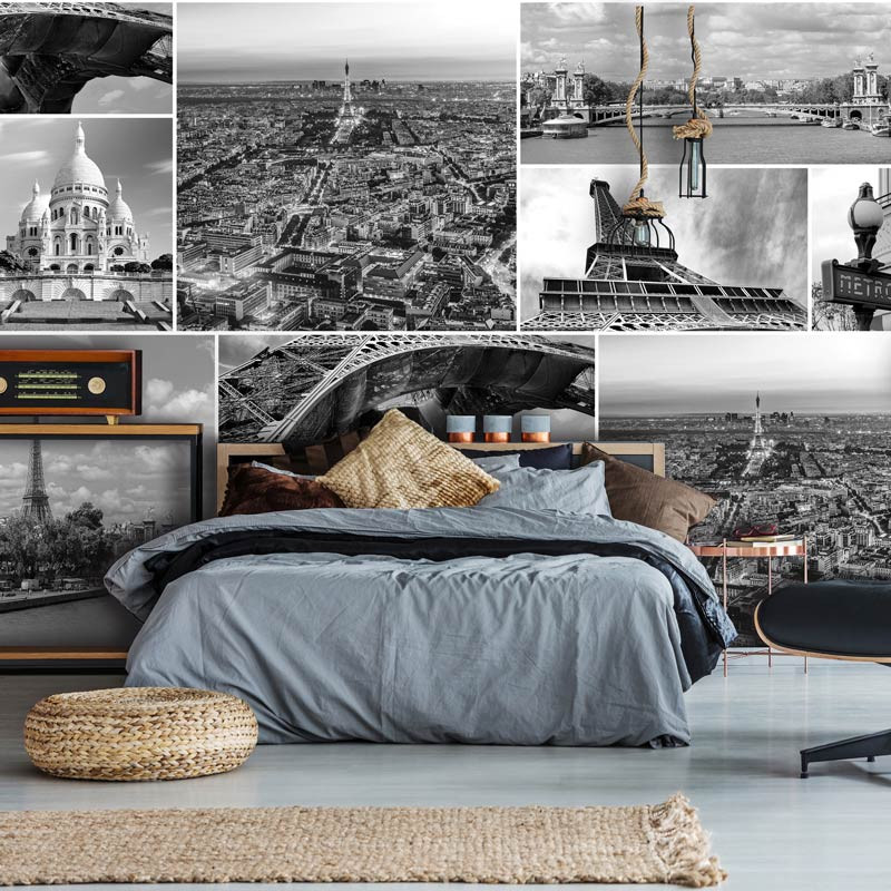 Vliestapete, die verschiedene Monumente in Paris abbildet, wie z.B. den: Eiffelturm, Sacré-C�ur, Pont Alexandre und Montmartre.