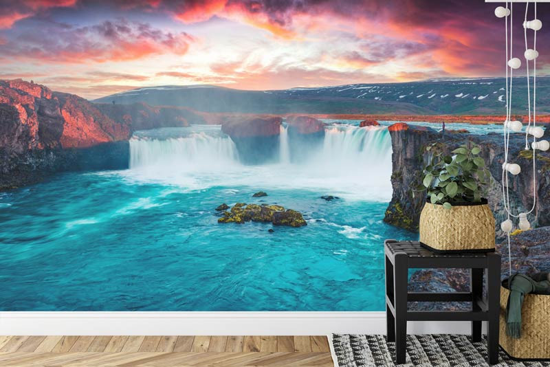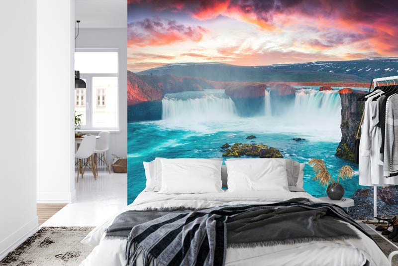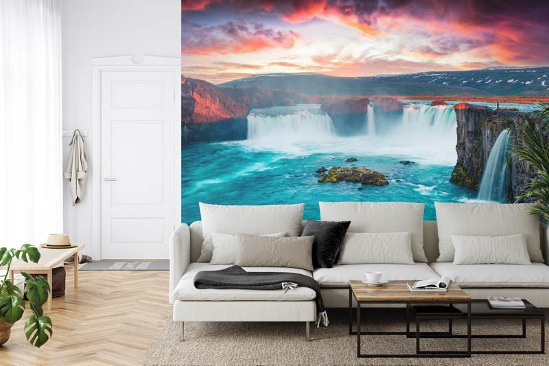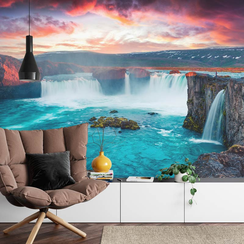 Schaffen Sie einen spektakulären Blickfang in Ihrem Wohnzimmer, Schlafzimmer oder Büro mit der Fototapete Der Godafoss-Wasserfall in Island. Lassen Sie sich von der beeindruckenden Pracht eines der schönsten Wasserfälle Islands faszinieren, wo sich kristallklares Wasser zwischen imposanten Felsformationen hindurchschlängelt. Erleben Sie die Kraft und Schönheit der Natur und lassen Sie sich in eine Welt des Friedens und der Schönheit entführen.