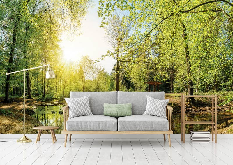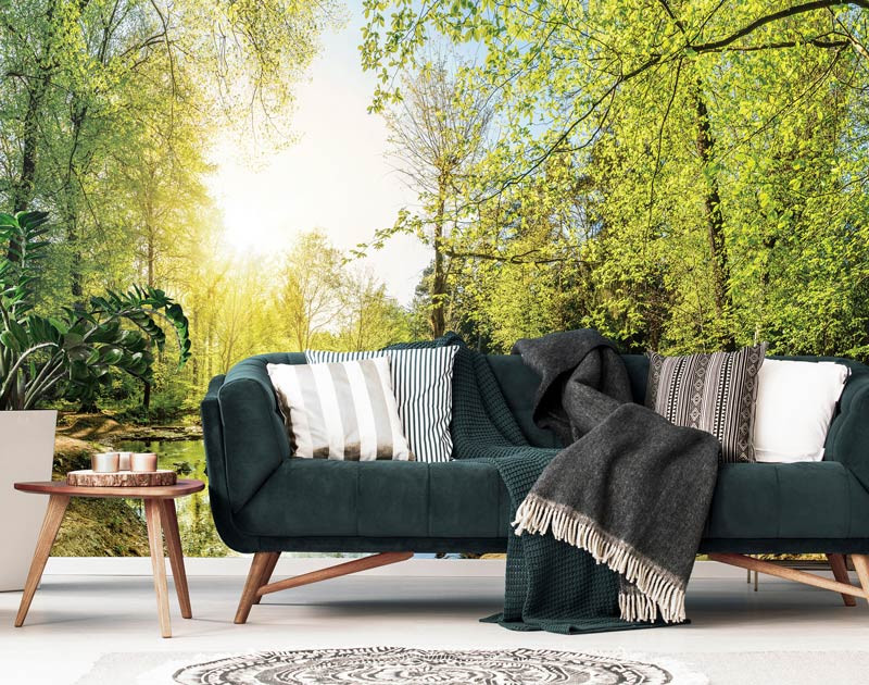 Vliestapete mit einer schönen, Baumlandschaft im grünen Wald, mit der hellen Sonne im Hintergrund.