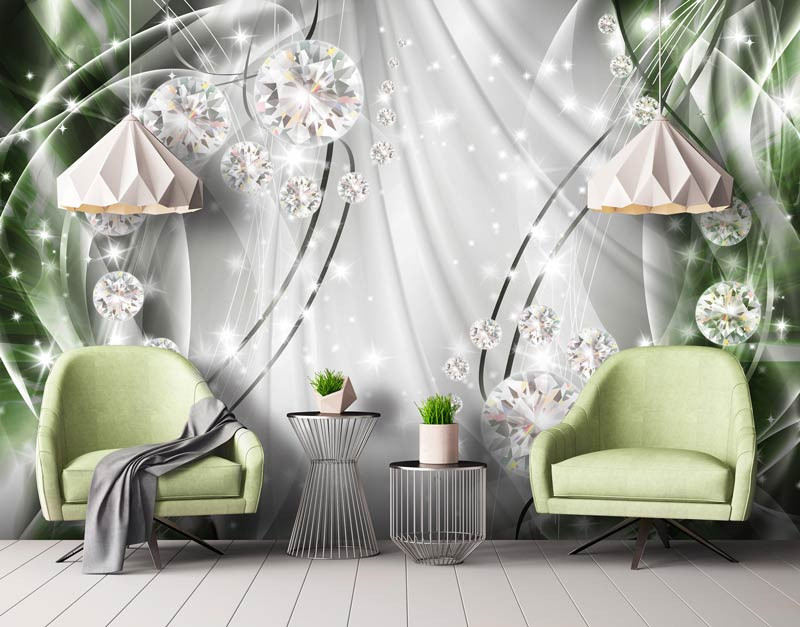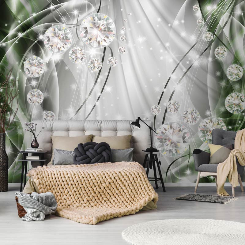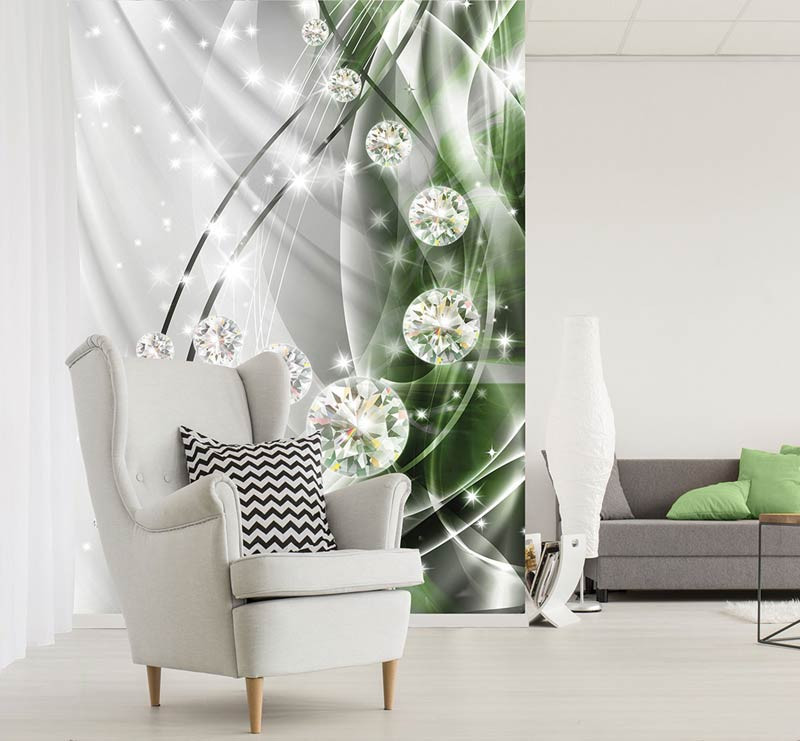 Vlies-Fototapete mit abstrakten, glitzernden Diamanten auf einem grünen und silberfarbenen Hintergrund.