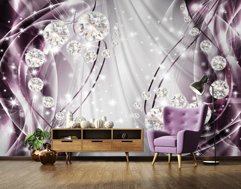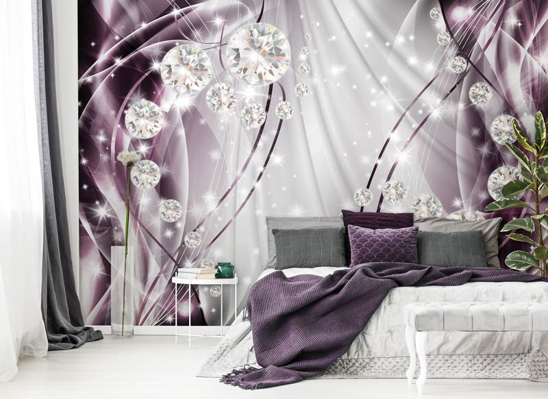 Vlies-Fototapete mit abstrakten, glitzernden Diamanten auf einem violetten und silberfarbenen Hintergrund.