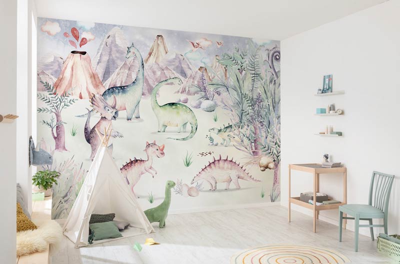 Die Dino-Fototapete kommt auf hochwertiger Vliestapete und ist die perfekte Ergänzung für jedes Kinderzimmer.