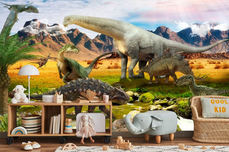 Bestellen Sie die individuelle Fototapete und verleihen Sie dem Zimmer Ihrer Kleinen eine einzigartige Note. Lassen Sie sie die prähistorische Schönheit dieser Kreaturen bewundern und ihre endlosen Fantasien genießen.