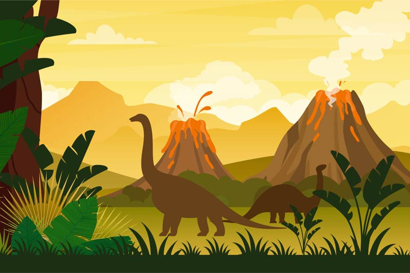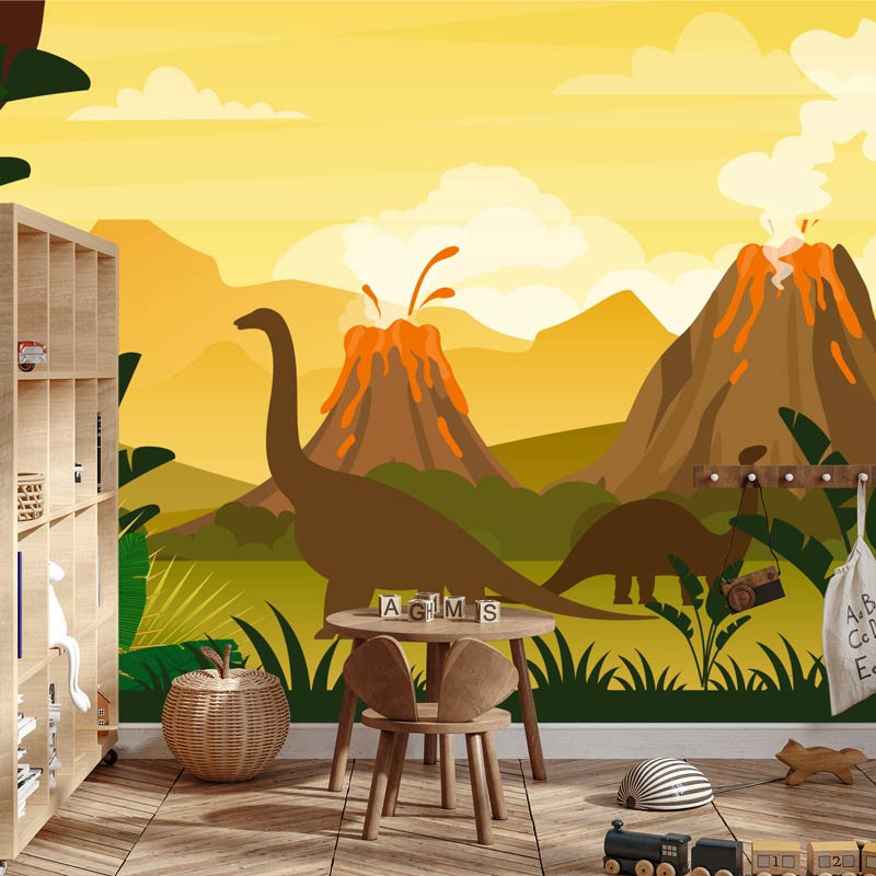 Verwandeln Sie das Kinderzimmer in eine prähistorische Landschaft mit unserer Fototapete Dinosaurier am Vulkan. Schaffen Sie eine abenteuerliche Umgebung, in der Ihre Kinder von Begegnungen mit mächtigen Dinosauriern phantasieren können.