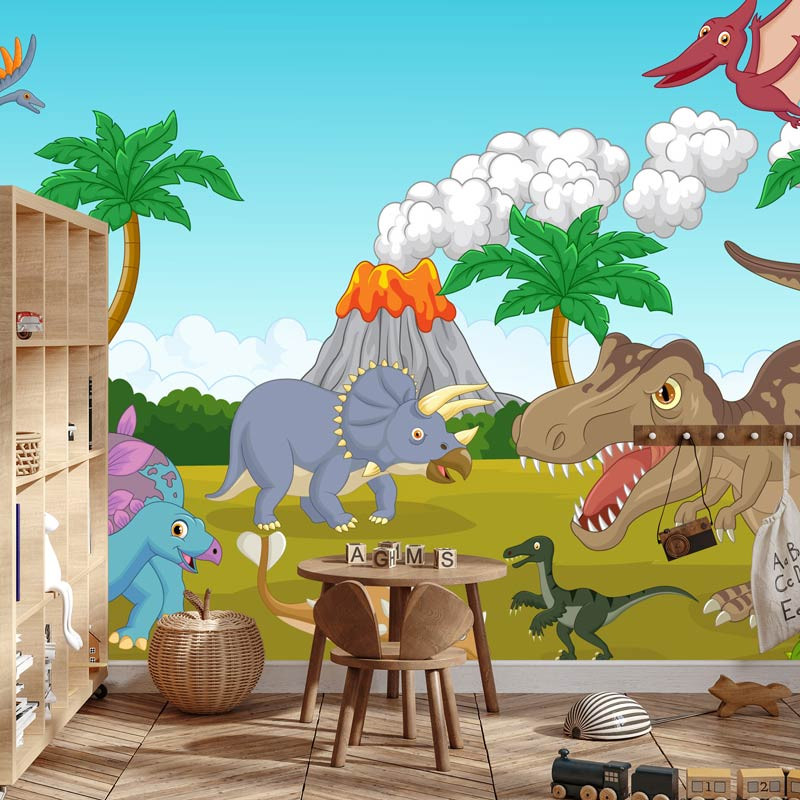 Bestellen Sie die individuelle Fototapete und lassen Sie Ihre Kinder endlosen Spaß zwischen den prähistorischen Giganten und dem Vulkan erleben.